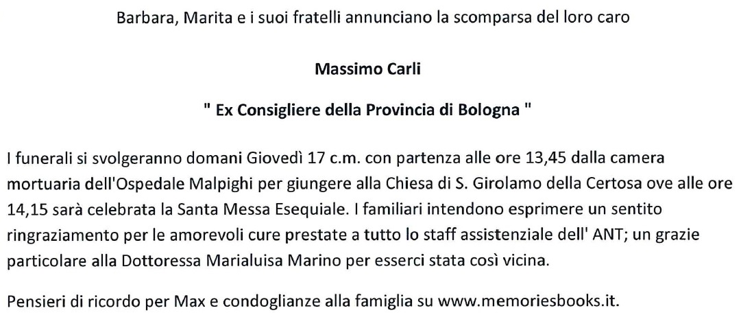 Caro Massimo, ti ho conosciuto alla casa di cura S. Anna dove facevi fisioterapia a mio padre che già era sulla carrozzina. Poi sei diventato il suo fisioterapista a casa prima poi, con la tua dolcezza, sensibilità, professionalità, un amico. Non ci hai lasciato neppure durante la malattia di mio padre dimostrando una generosità d'animo che raramente si vede. Ti sono riconoscente per tutto l'affetto che ci hai dato e che, durante questi tuoi mesi di malattia, ho cercato, con la mia mamma di dimostrarti. Ti abbiamo voluto veramente tanto bene Massimo e ti ringraziamo di vero cuore. Sei stata e sari per sempre una bellissima ed unica persona.